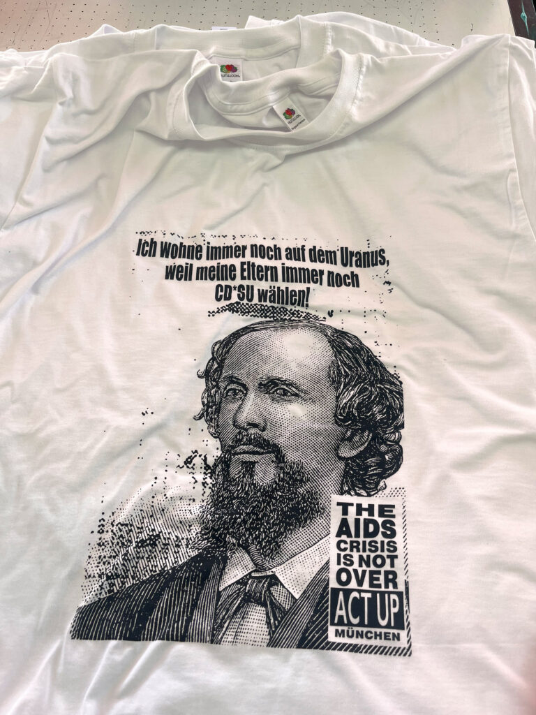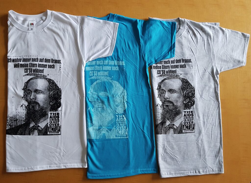 Die T-shirts können S, M, L, XL in weiß, S, M, XL in grau und S, M, XL, XXL in hellblau bei uns im Archiv oder hier für 20 Euro plus Versandkosten bestellt werden. Mit dem Kauf eines T-shirts unterstützt ihr unsere ehrenamtliche Archivarbeit.